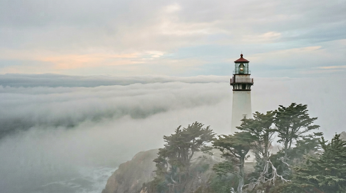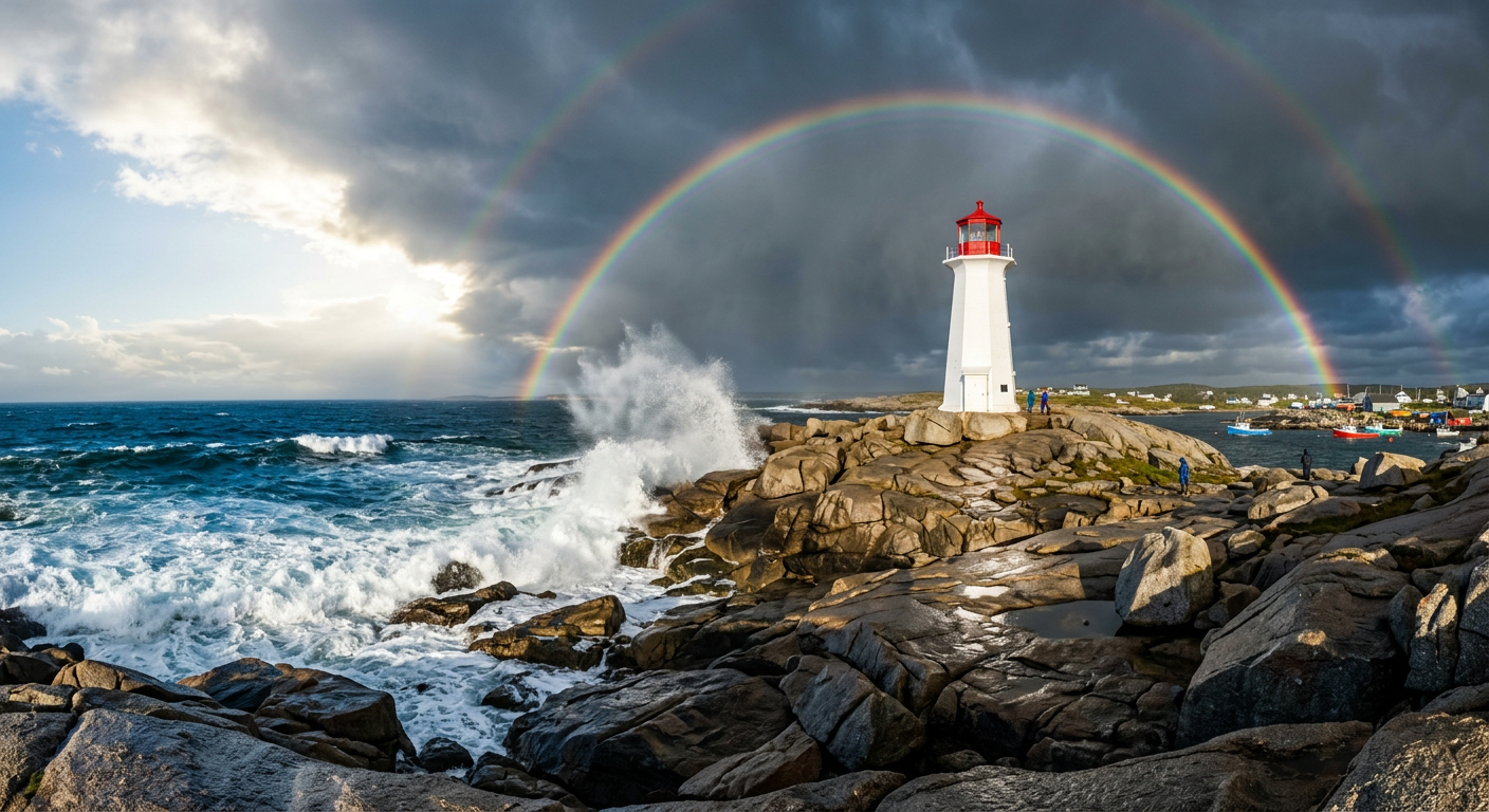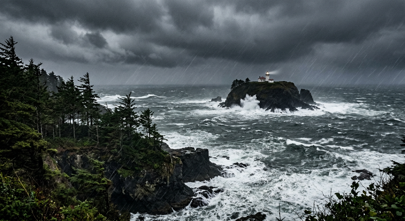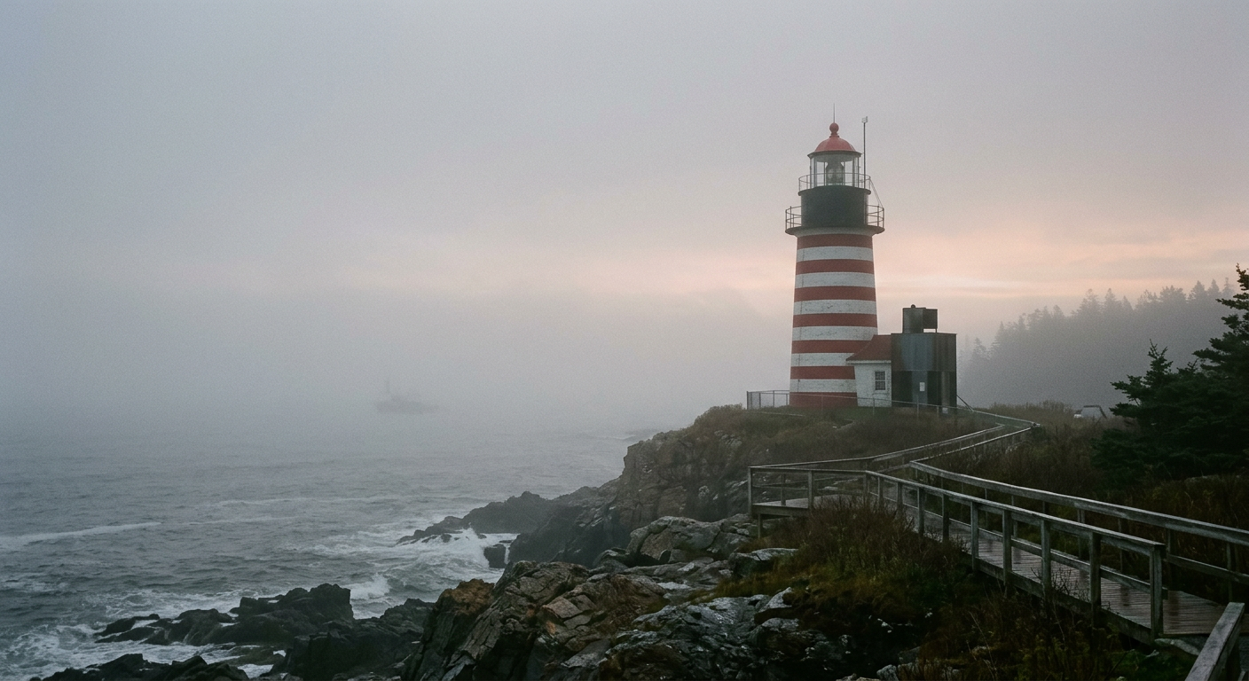 Images generated with Google Gemini 2.5 Flash Image from collaborative prompts. Each scene researched for geographic accuracy — real lighthouses, real coastlines, plausible weather.