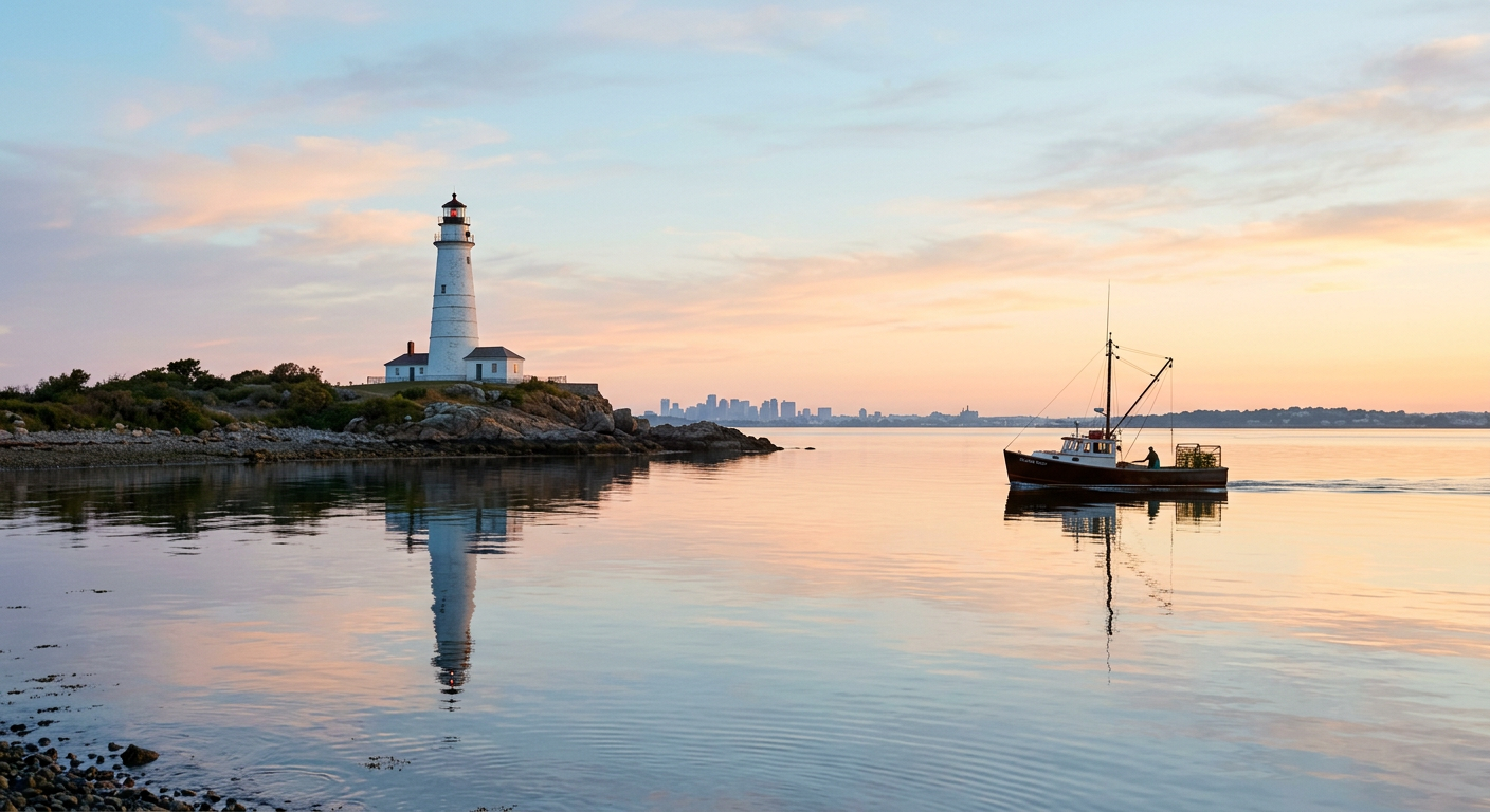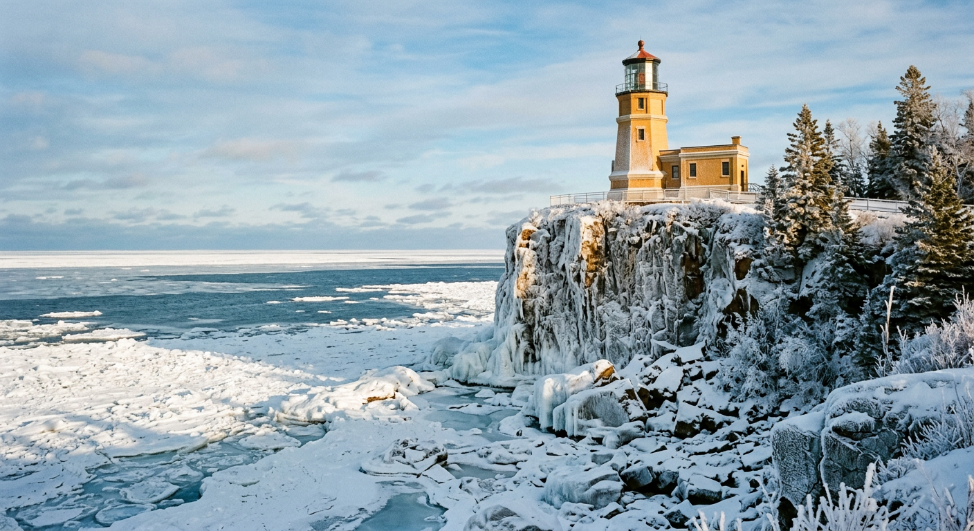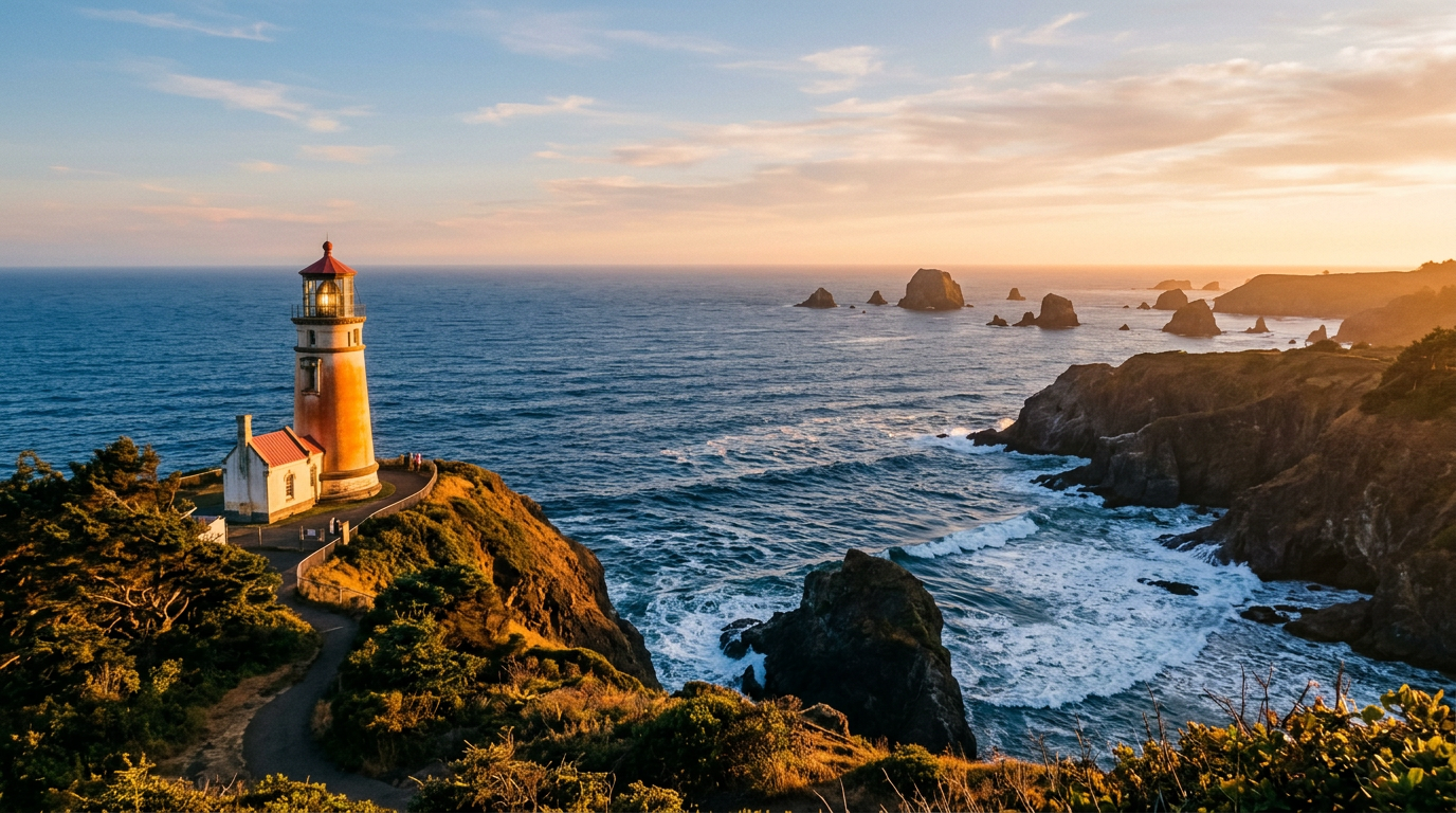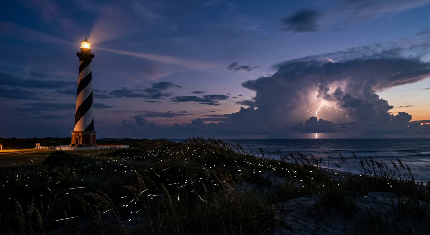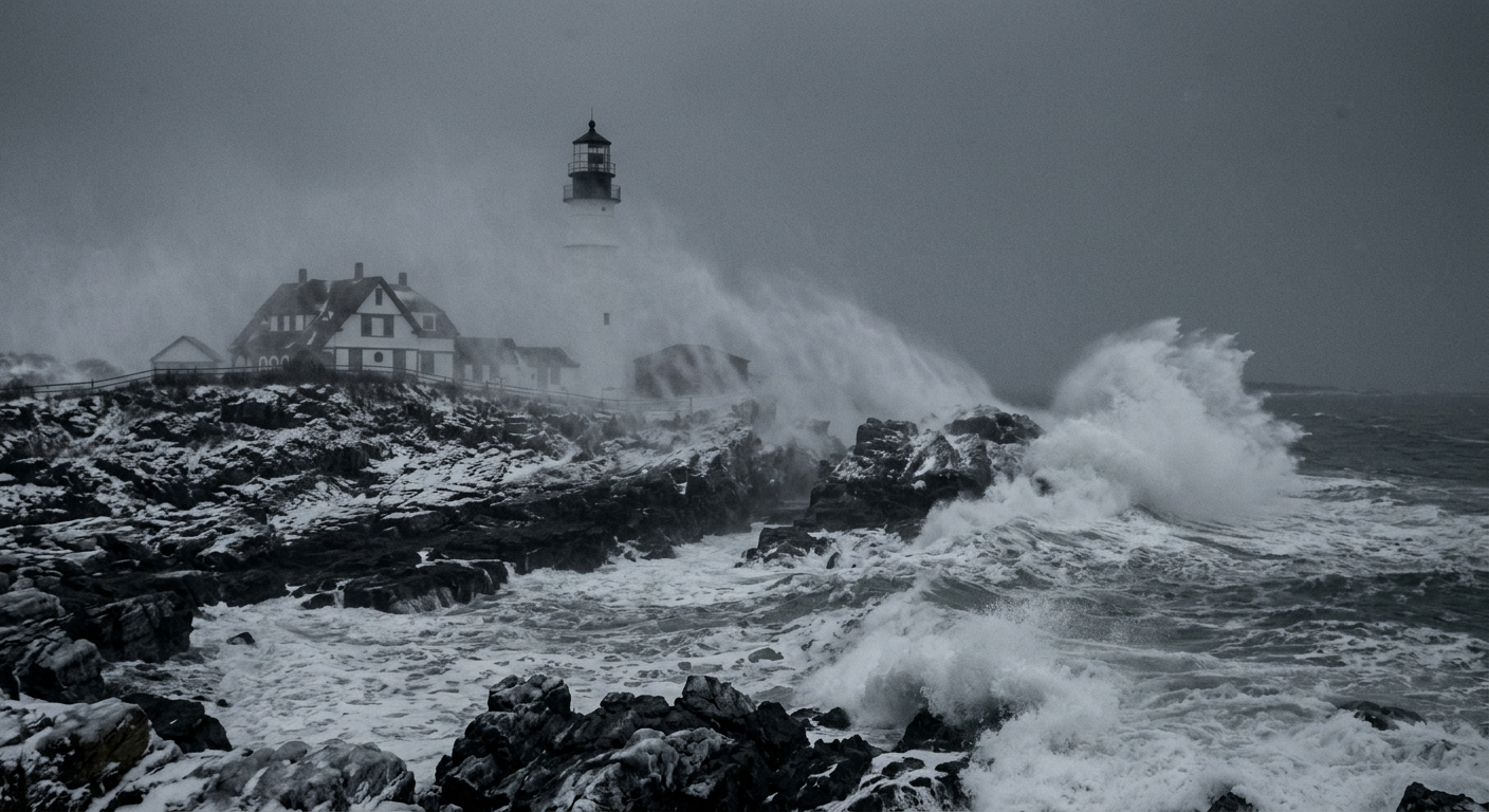 Images generated with Google Gemini 2.5 Flash Image from collaborative prompts. Each scene researched for geographic accuracy — real lighthouses, real coastlines, plausible weather.