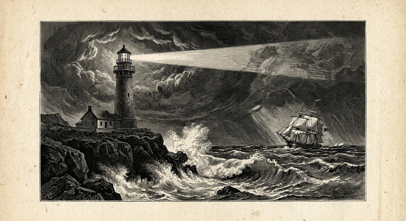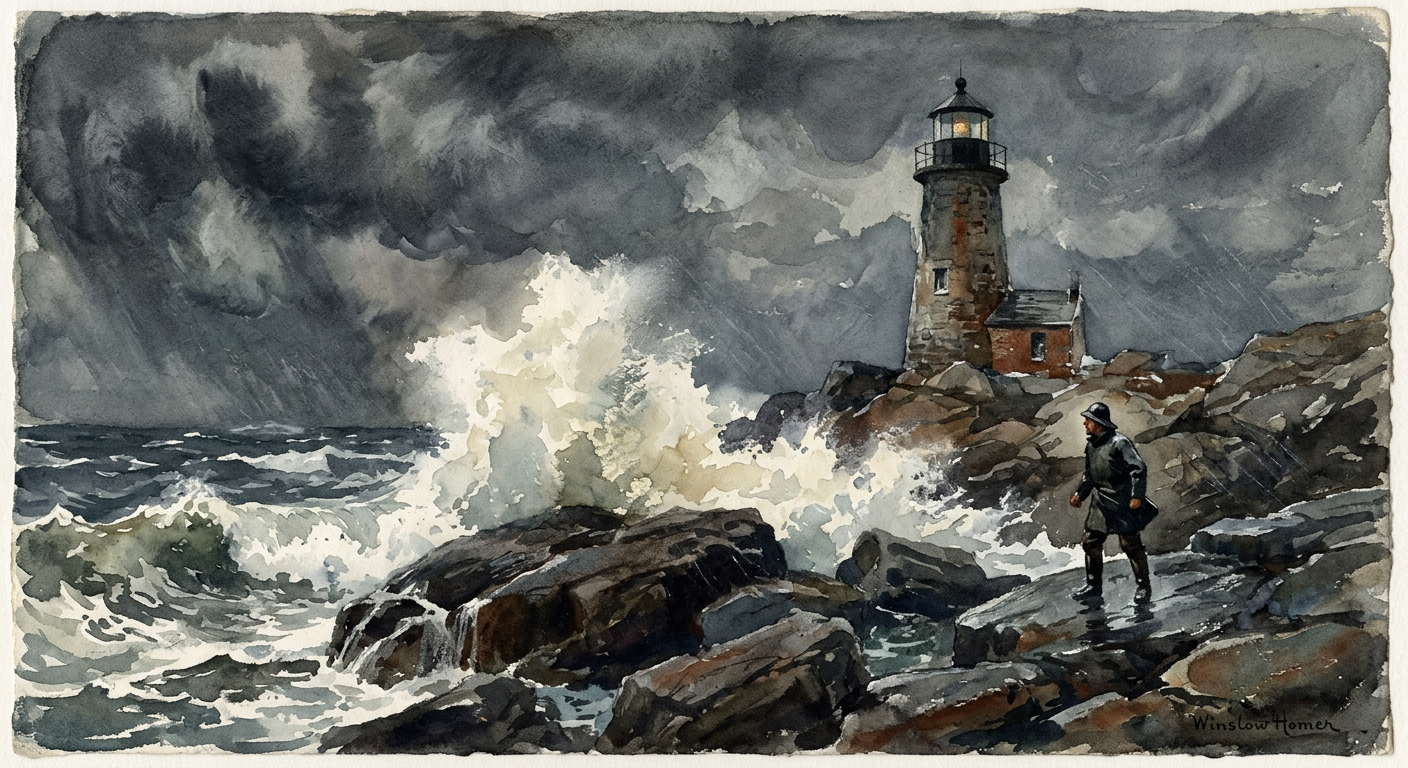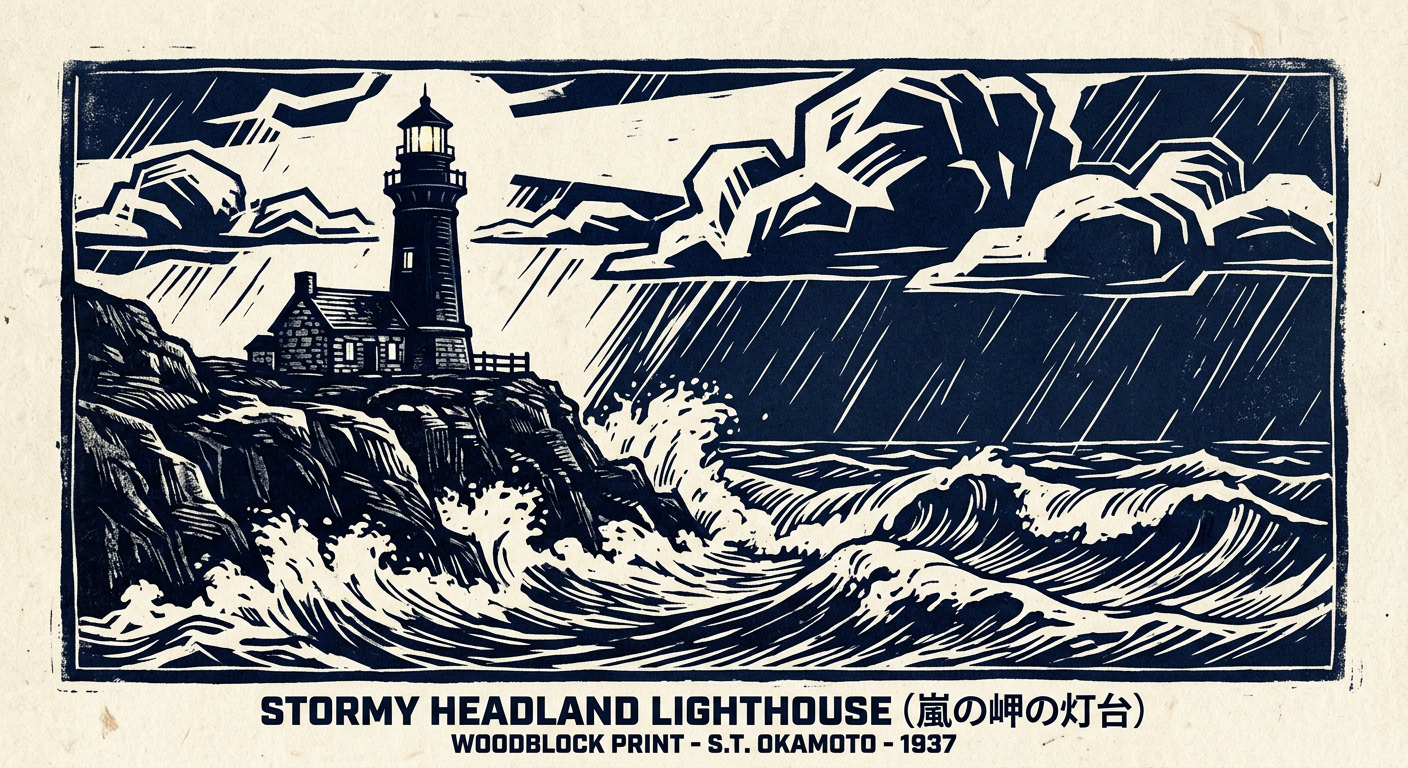 A dozen lighthouses across US and Canadian coasts, across seasons and weather conditions. Nine photographed — the Atlantic in a February nor'easter, the Pacific at golden hour, Lake Superior frozen in January. Three rendered in older styles: a Winslow Homer–inspired watercolor, a 19th-century steel-plate engraving, a Hokusai-style woodblock print.